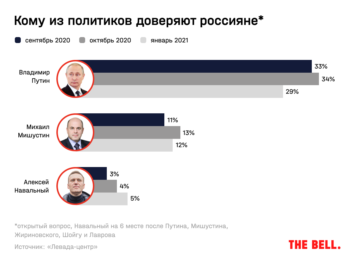 Уровень доверия Путину с сентября 2020 года упал на 4 п.п., до 29%, по результатам открытого опроса (то есть респонденты могли называть кого угодно). Навальному — вырос на 2 п.п., до 5%. Он на шестом месте в рейтинге доверия после Путина, Мишустина, Жириновского, Шойгу и Лаврова.