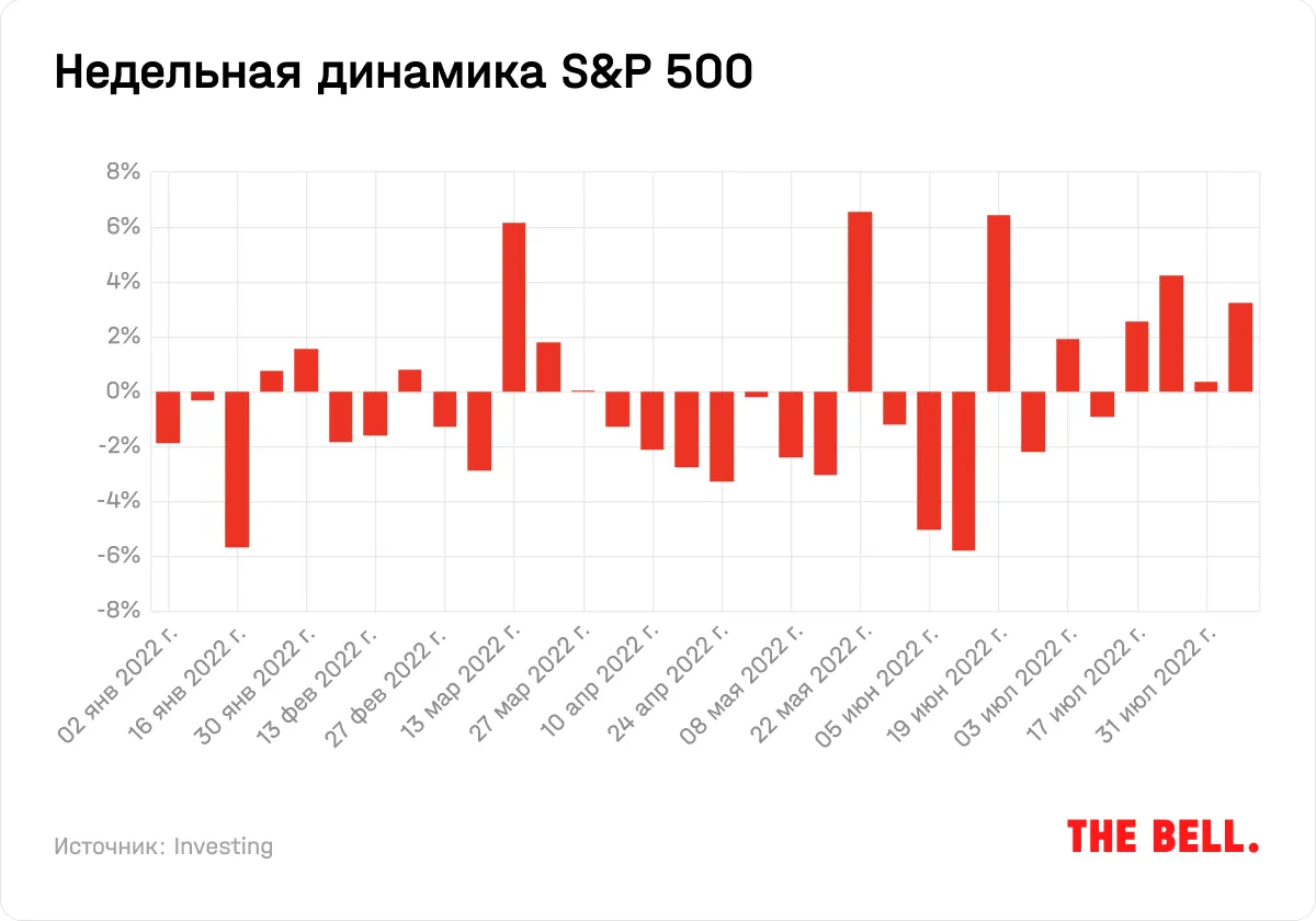 Но в середине лета настроения на американском рынке внезапно изменились. Индексы S&P 500 и Nasdaq начали расти: в период с 18 июня по 14 августа они четыре раза подряд показывали недельный рост, прибавив 10,8% и 13,9% соответственно. С июньских минимумов S&P 500 вырос на 16,7%, Nasdaq — на 22,6%.