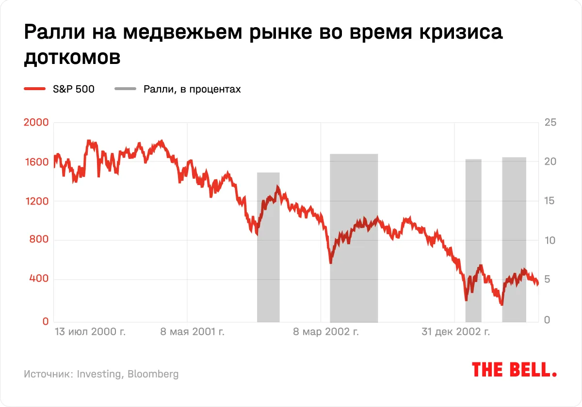 Подъем на американском рынке — повод задуматься о том, является ли это началом новой фазы «бычьего» рынка или передышка перед поиском нового дна. Ралли на «медвежьем» рынке, после которого падение возобновляется, — это нередкое явление. Например, по данным информационного бюллетеня InvesTech Research, на «медвежьих» рынках 2000–2002 годов и 2007–2008 годов было четыре подъема на 10% и более.