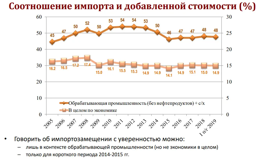 Из экономических отраслей, ориентированных на экспорт, более-менее самостоятельно развивались только нефтедобыча и нефтепереработка (с долей импорта в затратах порядка 5–10%, что тоже немало), пишет экономист. Металлургия, лесобумажная промышленность и в еще большей степени машиностроение, фармацевтика и здравоохранение зависят от импорта сырья и комплектующих куда сильнее. Умеренно конкурентоспособны сельское хозяйство, пищевая промышленность, производство стройматериалов, металлических изделий, судов и железнодорожной техники — но эти отрасли в основном ориентированы на внутренний рынок.