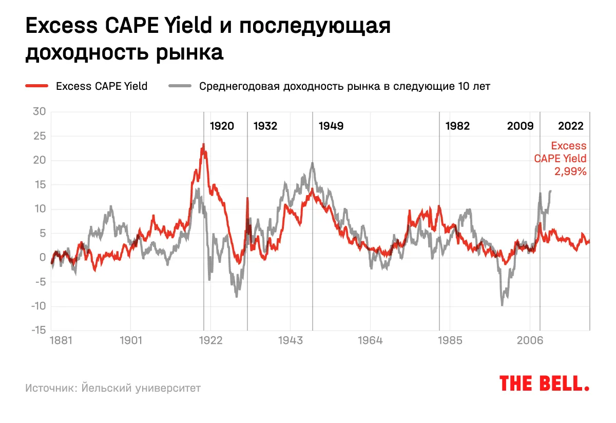 Чем меньше значение Excess CAPE Yield (ECY), тем больше акции переоценены по сравнению с облигациями, что может свидетельствовать о том, что рынок перегрет. Как показывают расчеты Bloomberg, индикатор ECY так же точно предсказывал доходность рынков в следующие 10 лет, по крайней мере в XX веке.