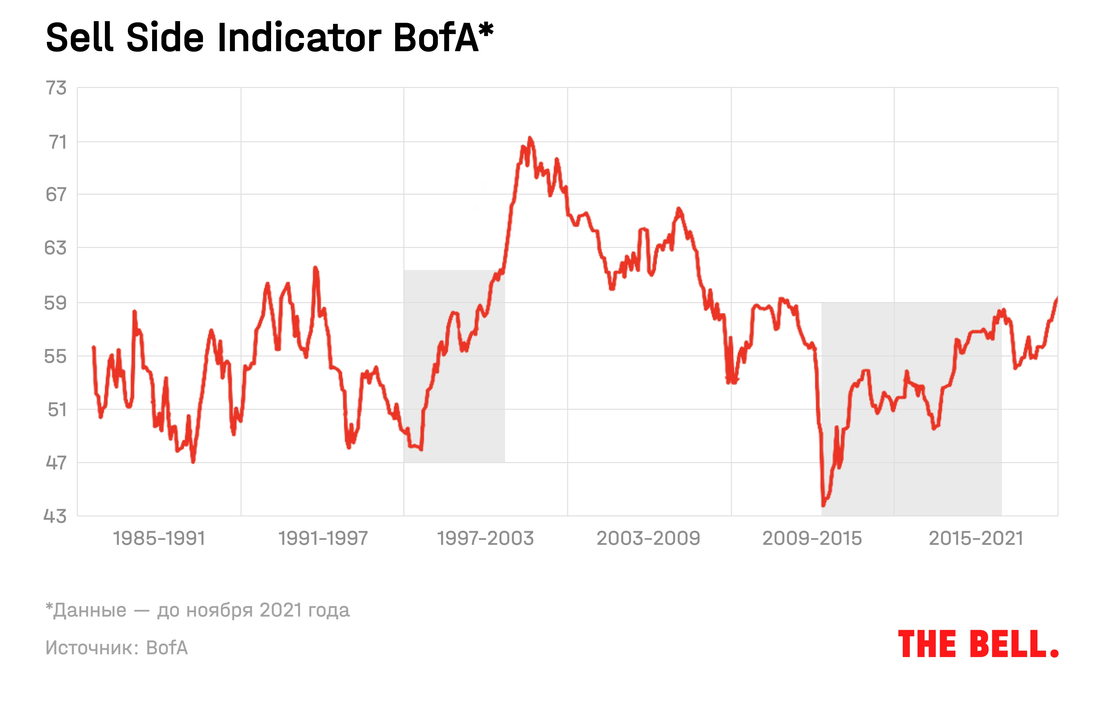 Как и во второй половине 1990-х, несмотря на высокие оценки, оптимизм управляющих растет. Sell Side индикатор (средняя рекомендованная доля акций в портфеле) вырос с 43% в 2013-м до 59,1% (по данным на ноябрь 2021-го). Как утверждает BofA, уровень этого индикатора негативно коррелирует с ожидаемой в ближайшие 12 месяцев доходностью по S&P 500.