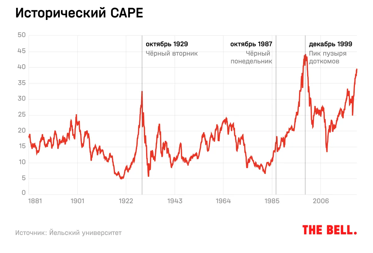 Сейчас рынок стоит чуть дешевле, чем перед пузырем доткомов, но быстро приближается к этому уровню. Циклически скорректированный индекс (cyclically adjusted Shiller price/earnings ratio, CAPE) нобелевского лауреата по экономике Роберта Шиллера, учитывающий отношение цен к прибылям за последние 10 лет, сейчас составляет 39,6 против 44,2 в декабре 1999 года. Это второй в 150-летней истории уровень рынка.