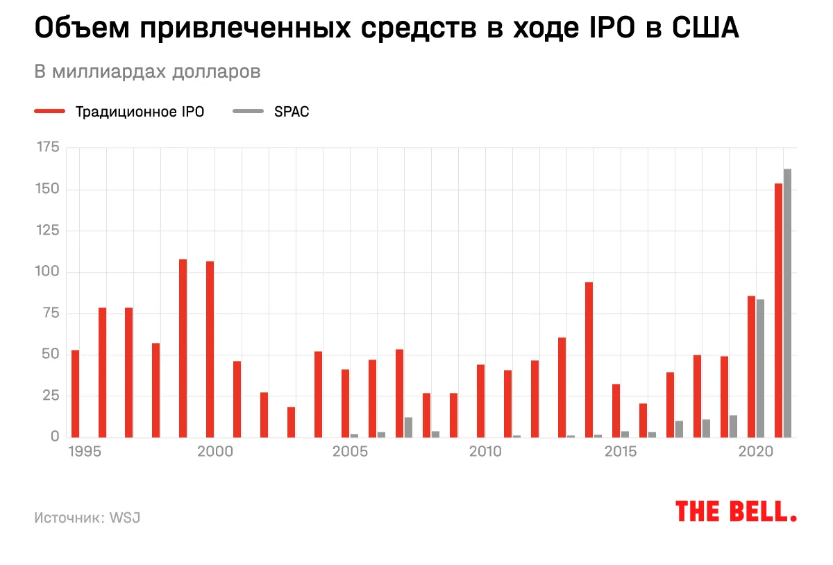 Большое количество ликвидности от ведущих центробанков и возможность получить высокие оценки при размещении на публичном рынке привели к буму IPO. В 2020 году в США было проведено 454 размещения (с учетом SPAC) на сумму $167 млрд, писала WSJ со ссылкой на данные Dealogic. Предыдущий рекорд по сделкам был зафиксирован как раз в 1999 году, когда акции разместили 547 компаний на $108 млрд.