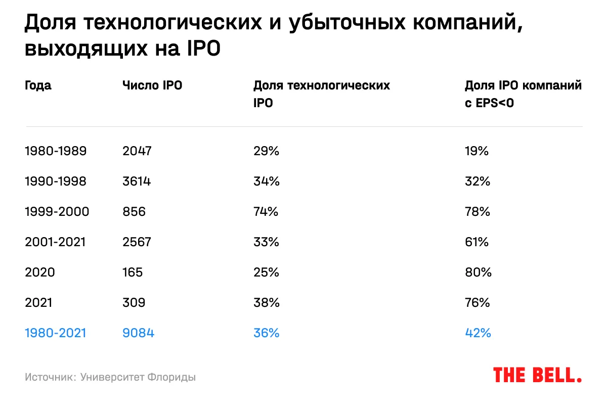И сейчас многие компании ради более высокой оценки мимикрируют под технологические, пишет WSJ, приводя в пример производителя матрасов Casper, называвшего себя «пионером экономики сна». Из 309 компаний, которые вышли на биржу в 2021 году, ¾ были убыточными в 12 месяцев, предшествовавшие IPO, — столько же, как и во время пузыря доткомов.