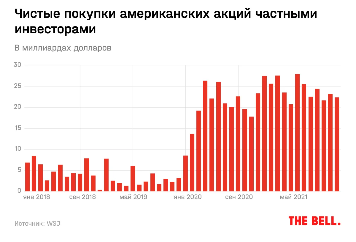 Как пишет WSJ со ссылкой на JMP Securities, если в 2020 году в США было открыто 10 млн новых брокерских счетов, то в 2021-м — уже 15 млн. В 2021 году чистые покупки американских акций составили $292 млрд — это в семь с лишним раз превышает показатель 2019 года.