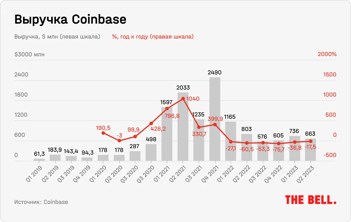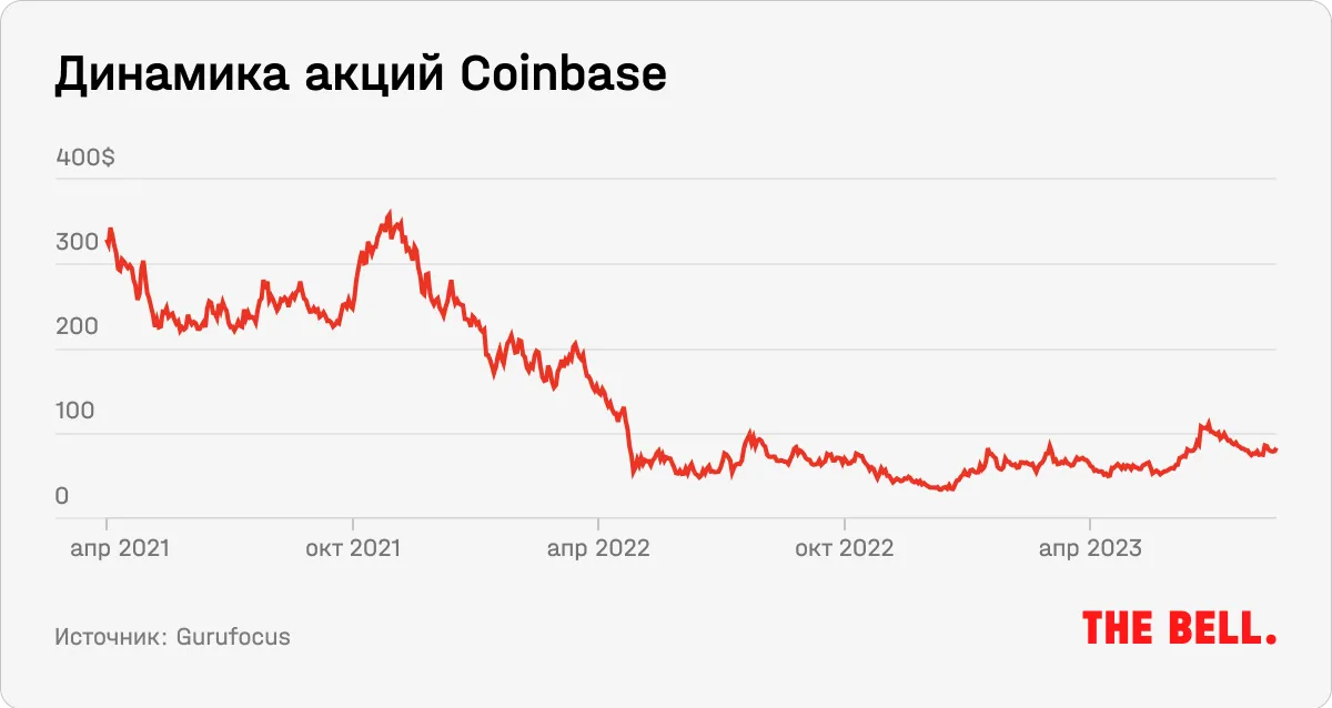 Резкое снижение цен на криптовалюты в 2022 году привело к сильному снижению объемов торгов и, как следствие, комиссий Coinbase. Если во время криптобума 2021 года Coinbase получила чистую прибыль в $3,6 млрд, то теперь компания убыточна: ее потери по итогам последнего квартала составили $97 млн. Правда, год назад ситуация была куда хуже: тогда квартальный убыток составил $1,09 млрд. Биржа резко продолжила сокращать операционные расходы: в 2022–2023 годах был уволен каждый пятый сотрудник. Однако, несмотря на это и рост биткоина, в этом году прибыль Coinbase не растет. Это является следствием проблем криптоиндустрии в целом, до сих пор не оправившейся после банкротства FTX и некоторых других криптопроектов и обвала цен на криптовалюты.