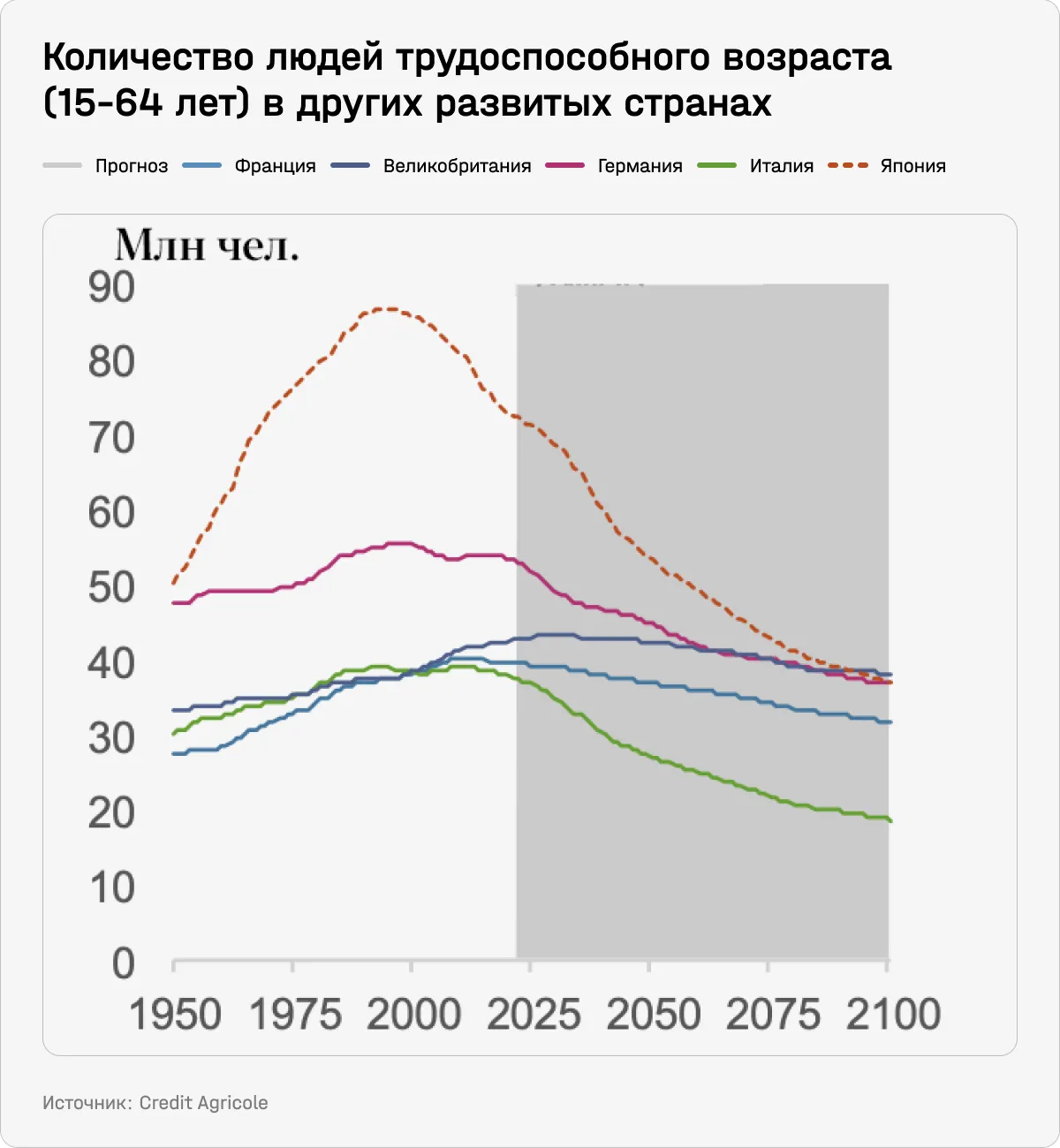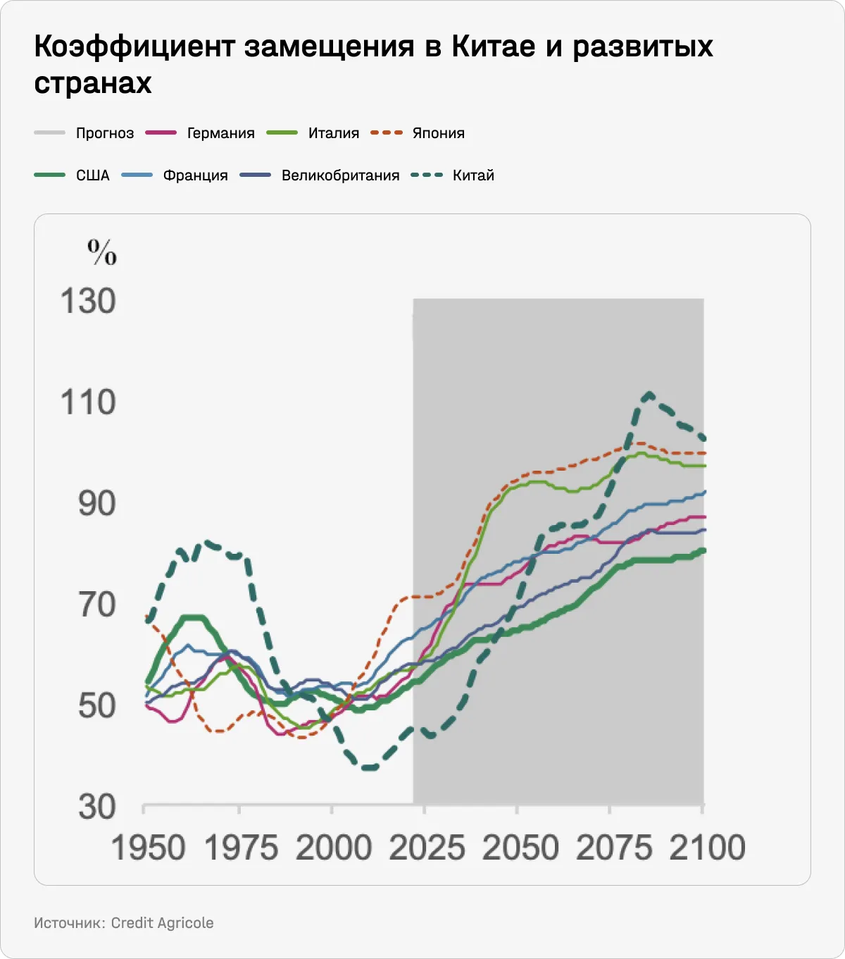 Из-за более высокой продолжительности жизни и замедления роста населения коэффициент замещения (отношение тех, кто находится в нетрудоспособном возрасте, к тем, кто в трудоспособном) увеличивается во всех ключевых странах. Это тоже явный проинфляционный фактор: неработающие потребляют больше, чем производят. Повлиять на этот тренд могло бы изменение миграционной политики, говорится в отчете.
