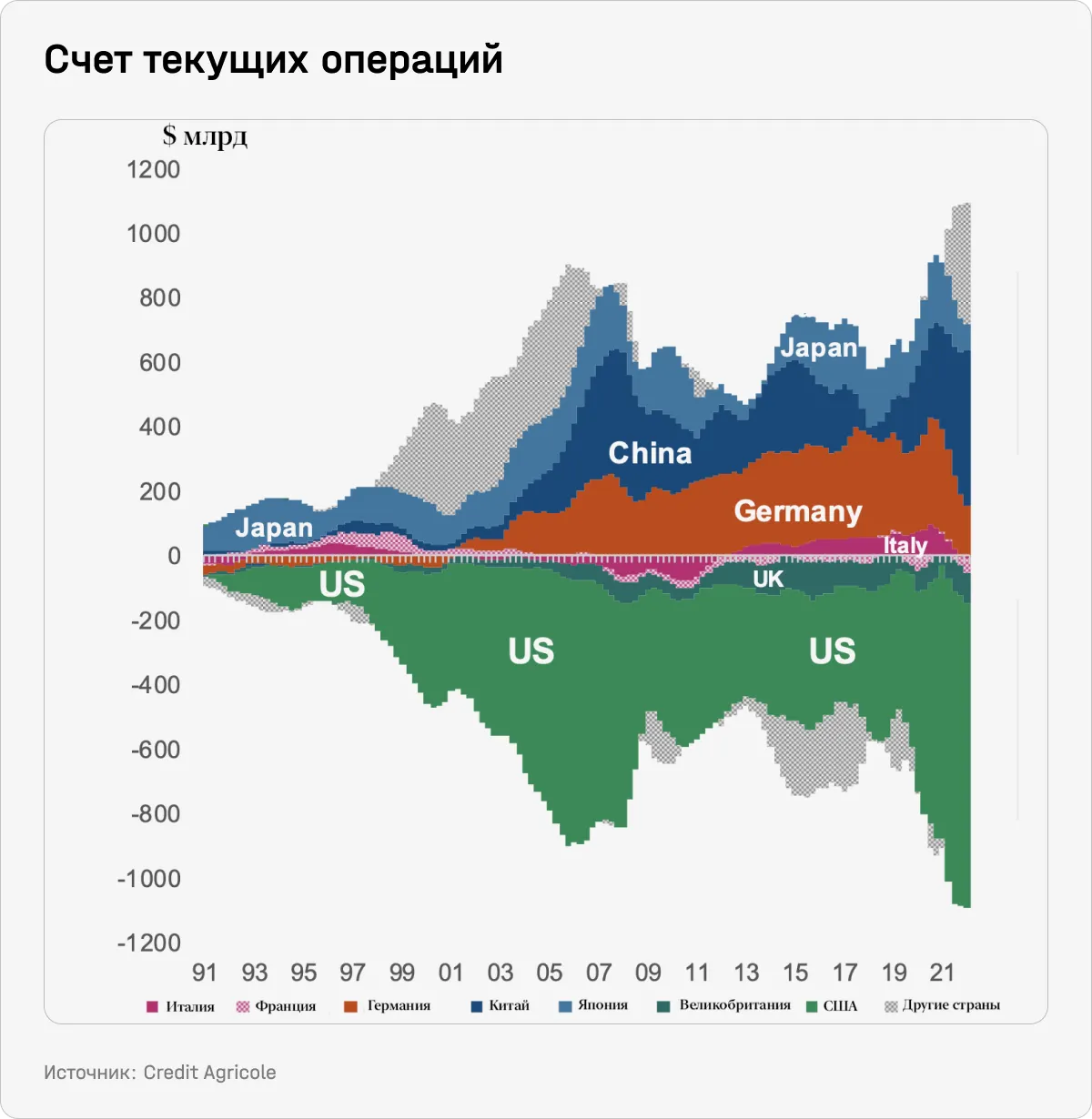 В то же время в 2010-е годы попытки справиться с низкой инфляцией (в том числе Абэномика) привели к росту импорта. Счет текущих операций стал дефицитным в реальности, а на бумаге профицит поддерживается только за счет доходов от предыдущих вложений за рубежом. По расчету Credit Agricole, профицит сократится с 3% до 1%, что уберет весомый дезинфляционный фактор, в том числе в странах с дефицитом счета текущих операций: США, Великобритании и Франции.
