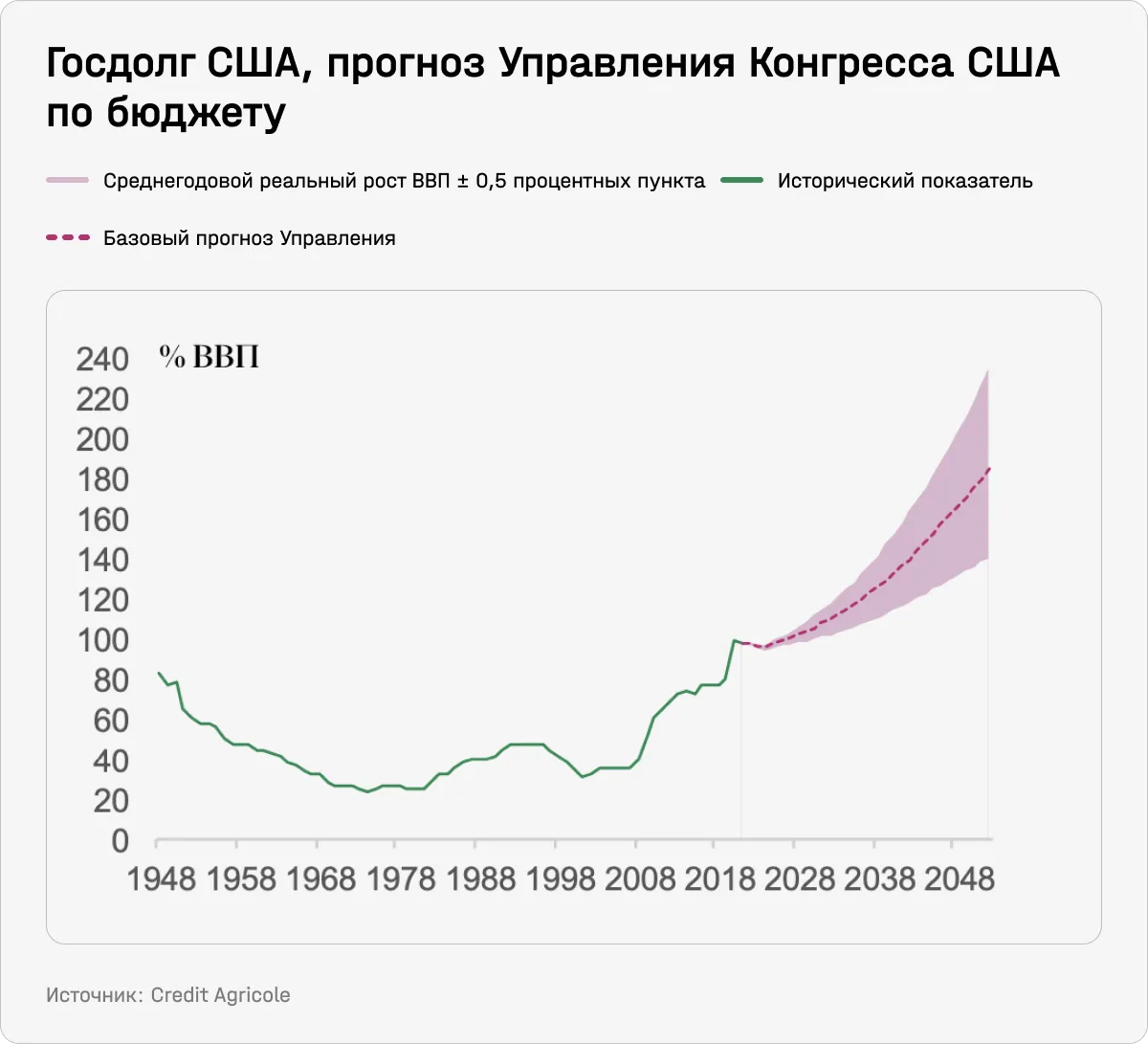 Дополнительный источник для беспокойства — фискальная политика развитых государств, и прежде всего США (из-за их влияния на мировую экономику). Рост госдолга находится на «неконтролируемой траектории» — и пока фискальная консолидация не планируется, отмечают в Credit Agricole. По прогнозу Управления Конгресса США по бюджету, госдолг к 2050 году должен вырасти в два раза, до 150% ВВП. Рост госдолга на 1% ВВП, по разным экономическим исследованиям (например, этом, где в соавторах — бывший министр финансов США Ларри Саммерс), трансформируется в рост реальных ставок на 3–4 б. п., говорится в отчете. При снижении уверенности в обслуживании долга инвесторы требуют более высокой премии за вложение в суверенные бумаги.