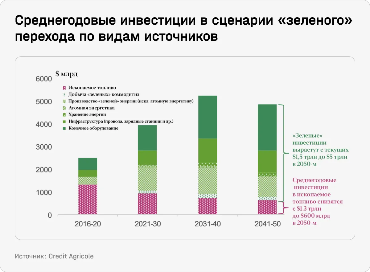 - Экология. «Зеленые» инвестиции резко интенсифицируются: по подсчетам Bruegel, поставленные Парижским соглашением цели по достижению углеродной нейтральности к 2050 году потребуют $2–3 трлн дополнительных инвестиций каждый год. Для сравнения, это примерно равно ⅓ глобальных корпоративных прибылей и ⅕ налоговых выплат.