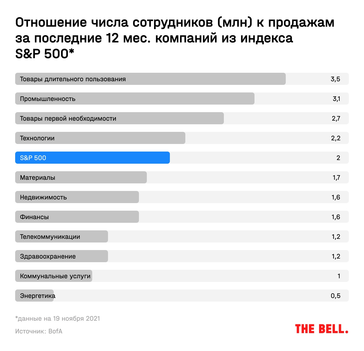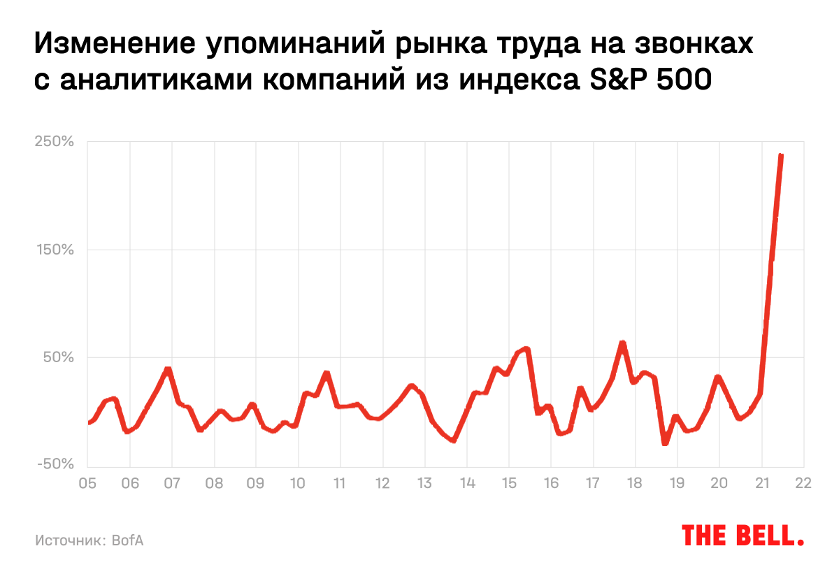 Дефицит кадров на рынке труда и рост зарплат станет одной из самых больших проблем для компаний в 2022-м, говорится в отчете BofA: на оплату труда приходится около 40% всех затрат в частном секторе в США. Упоминания рынка труда на звонках с аналитиками по итогам третьего квартала выросли на 234% год к году и на 126% по сравнению со вторым кварталом.
