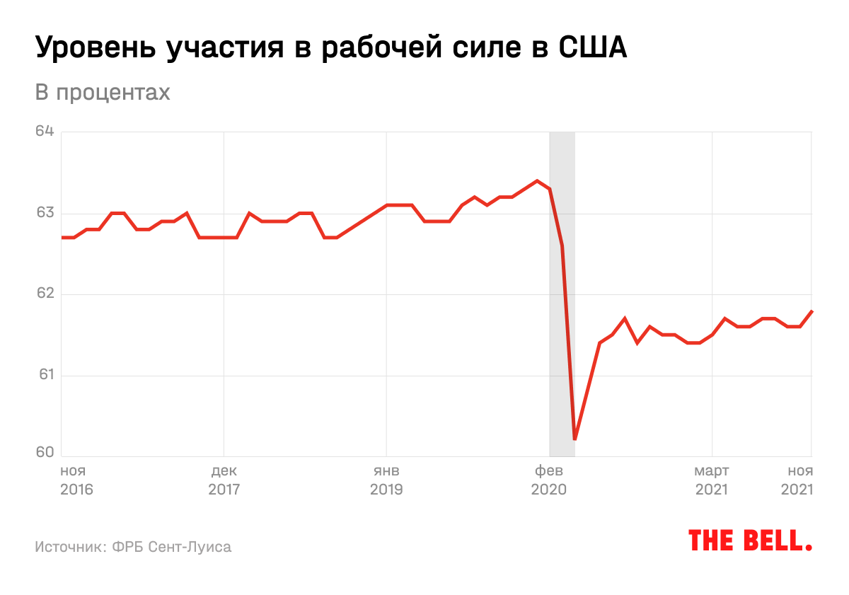 Многие американцы в прошлом году покинули рынок труда из-за боязни коронавируса и ограничений бизнес-активности. Ожидалось, что к осени 2021 года, когда школы и детские сады возобновят работу, а чеки от государства перестанут приходить, рынок труда восстановится. Но реальность оказалась не такой, как предсказывали экономисты. Уровень участия в рабочей силе в США — то есть доля взрослых американцев, которые имеют работу или ищут ее, — с лета 2020 года восстановился менее чем наполовину по сравнению с допандемийным уровнем. Сейчас этот показатель находится на минимумах с 1970-х годов.