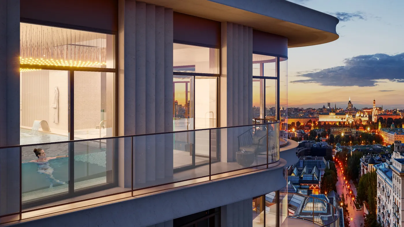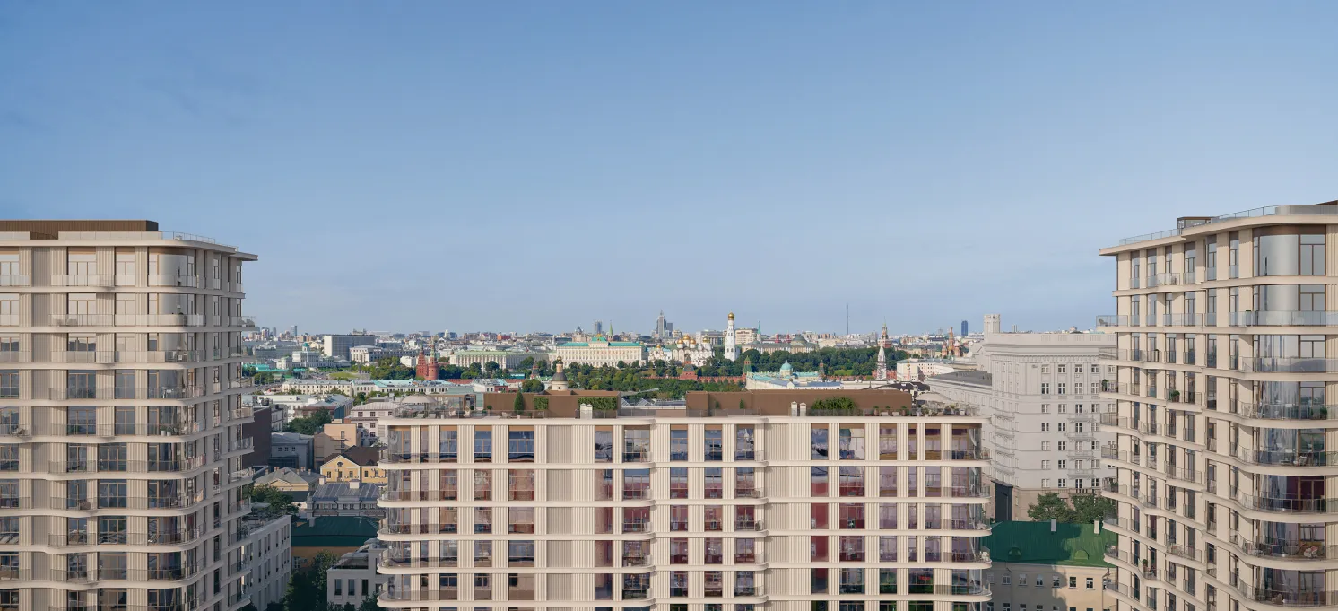 Доля квартир с видом на Кремль достигает здесь 72%. Автору проекта, главе архитектурного бюро СПИЧ Сергею Чобану удалось добиться этого благодаря высоте зданий (от 8 до 14 этажей) и их посадке параллельно Кремлевской стене. Кроме того, это самое высокое новое здание в районе Якиманка, и малоэтажная прилегающая застройка не загораживает вид на главную столичную достопримечательность. Панорама открывается уже с третьего этажа, а моллированное остекление, эркеры, просторные балконы и террасы только усиливают эффект. Жемчужины дома — двухэтажные пентхаусы, в которых наслаждаться видом на Кремль можно из собственного бассейна.