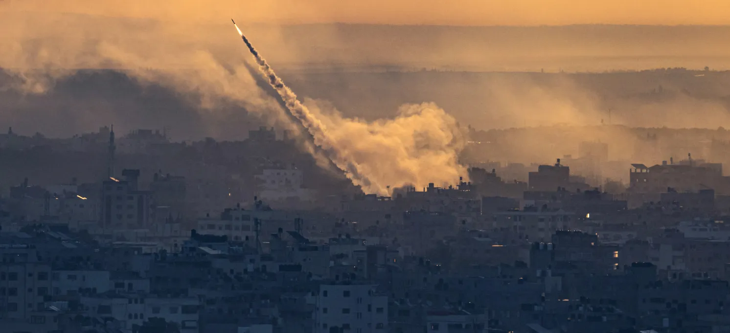 Боевые действия начались рано утром в субботу 7 октября с массированных ракетных обстрелов израильской территории. На фото одна из ракет, выпущенных из сектора Газа по Израилю.