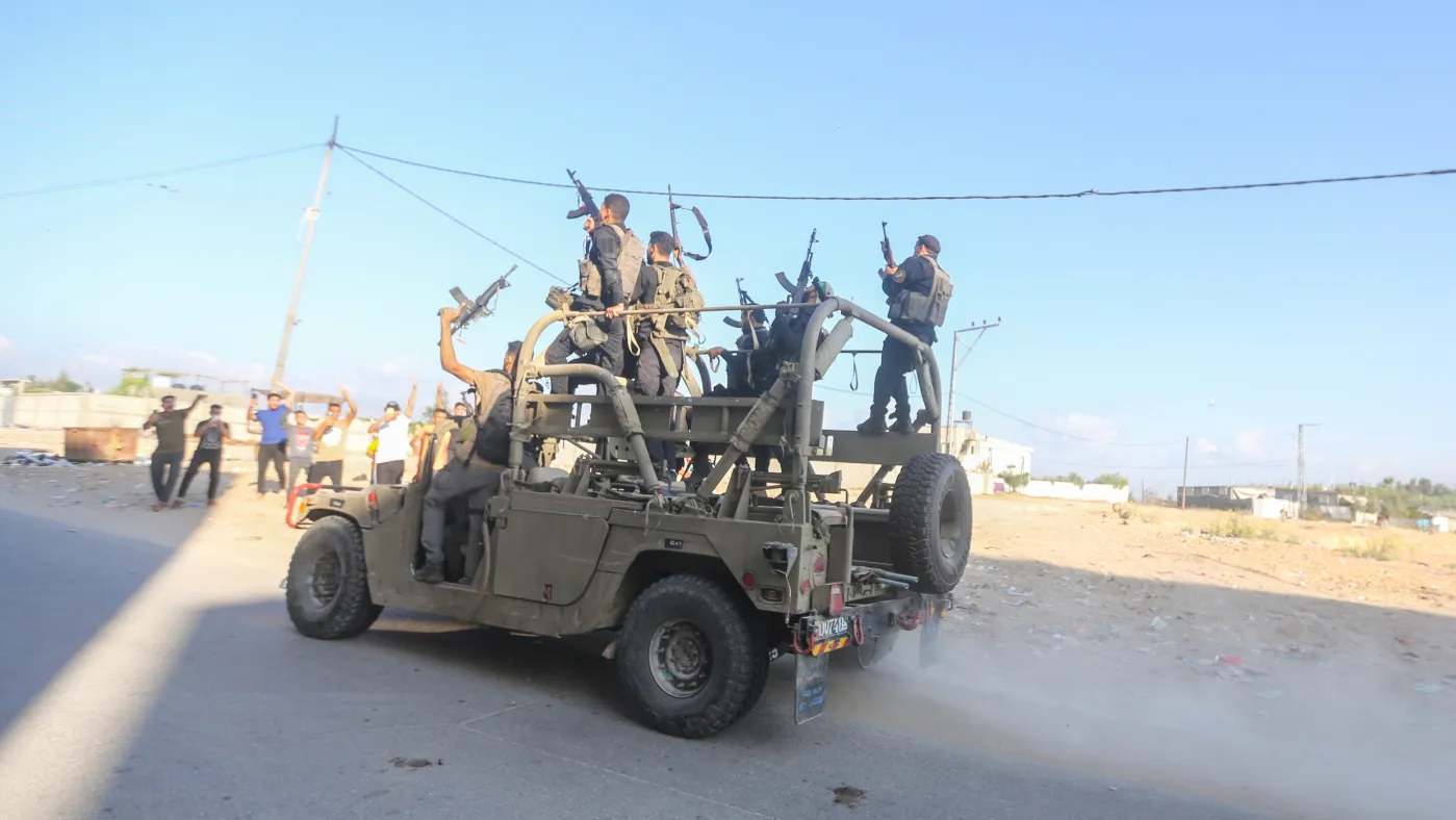 Боевики «Хамас» на угнанном израильском военном автомобиле, 7 октября. Уничтожение и захват израильской военной техники — беспрецедентны для арабо-израильских столкновений.