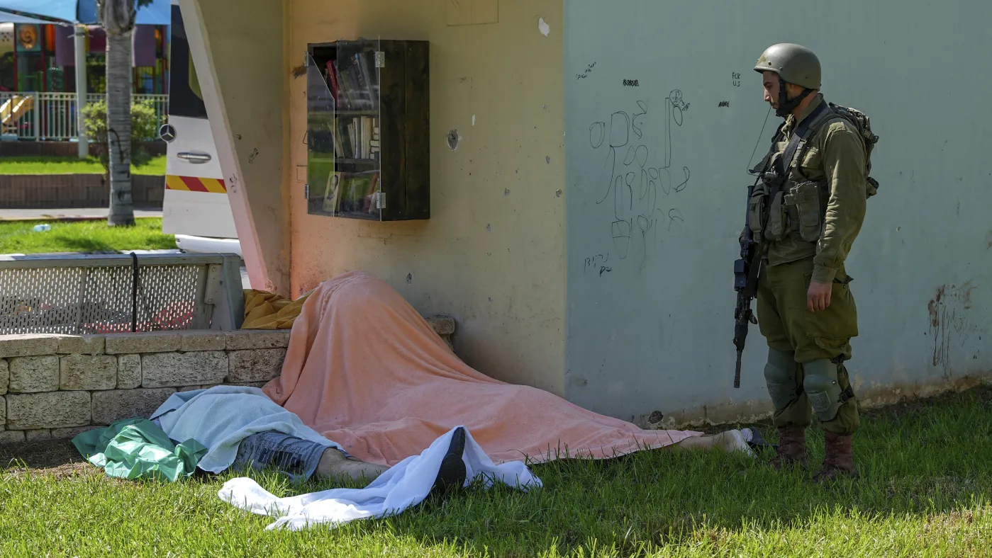 Израильский солдат стоит над телами погибших в результате атаки «Хамас» на Сдерот на юге Израиля, 7 октября. Город подвергся не только обстрелу, но и вторжению диверсантов. По состоянию на утро понедельника столкновения там продолжались.