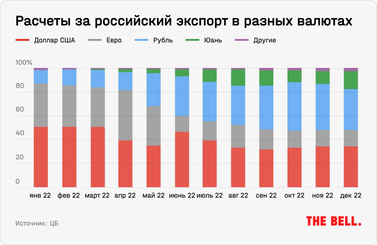 Еще после 2014 года российские власти взяли курс на снижение зависимости российского финансового сектора от валют западных стран, вводящих против России санкции, прежде всего — доллара. Этот процесс существенно ускорился после вторжения 24 февраля 2022 года. В результате теперь почти половину внешнеторговых расчетов российские фирмы производят в рубле и юане, отчитался Банк России.