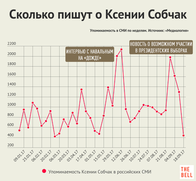 Если говорить о росте упоминаемости, то возможное участие Собчак в выборах – в любом качестве – уже принесло свои плоды. 1 сентября, когда «Ведомости» опубликовали статью с предположением о том, что Собчак может выдвинуться в президенты, ее упоминаемость в СМИ резко взлетела.  Впрочем, летнее интервью с Навальным все равно дало больше.