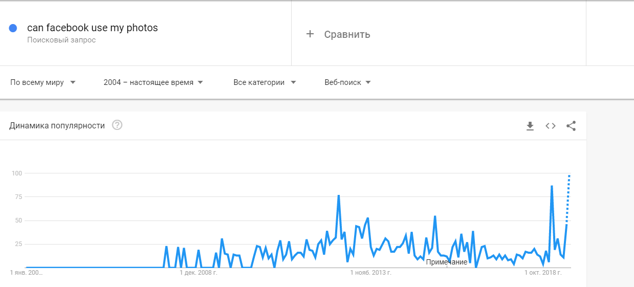 • Из статистики запросов в Google «может ли Facebook использовать мои фотографии» видно, что распространение фейка достигало пиков в начале 2008 года, осенью 2009-го, в декабре 2012-го, осенью 2015-го. Последний и самый крупный пик — сейчас.