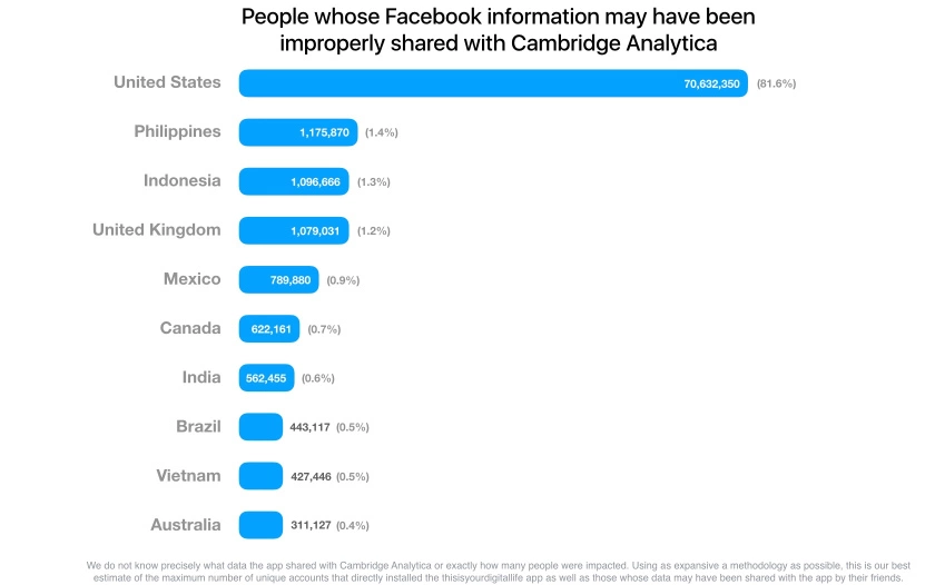 • Из 87 млн пользователей, чьи данные могли стать доступны Cambridge Analytica, подавляющее большинство (около 70 млн, 81%) живет в США. Россиян в списке «самых популярных» стран, где произошла утечка, нет. Однако Facebook оговаривается, что пока это очень приблизительная информация: компания брала максимально возможную цифру, фактически она может быть меньше.