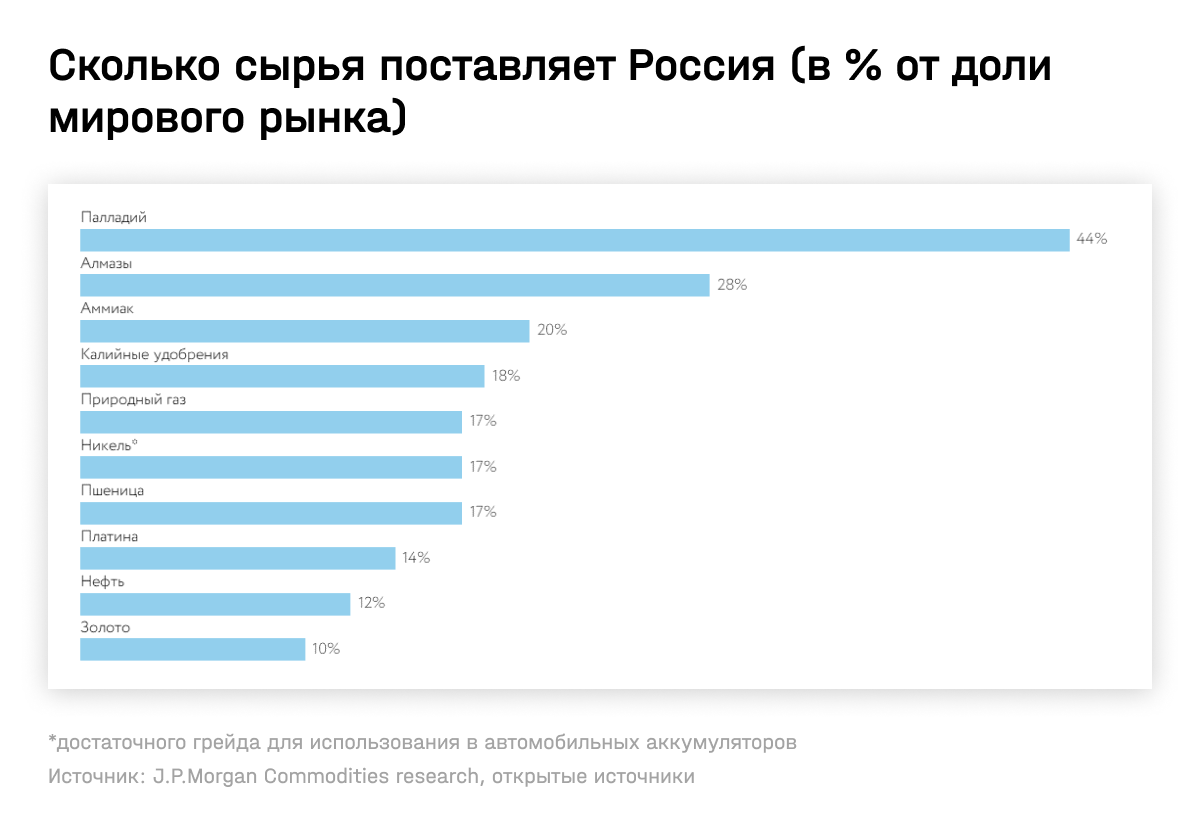 На первый взгляд доля России в мировом номинальном ВВП составляет незначительные 1,7–1,8%. Но это лишь на первый взгляд: по целому ряду видов сырья Россия — один из ключевых игроков глобальной экономики. Например, страна обеспечивает 44% мировых поставок палладия, 28% поставок алмазов, по 17% никеля, пригодного для использования в автомобильных аккумуляторах, и пшеницы (подробнее см. график).
