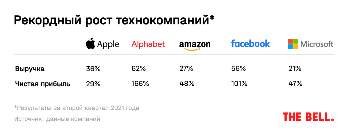 Парад отчетности (свои результаты на этой неделе представили Alphabet, Apple, Microsoft, Facebook, Amazon) не мог не принести рекордных результатов — техногиганты находятся на пике роста, обусловленного постпандемической цифровизацией. Все они показали рекордные квартальные результаты, а отчетности некоторых (например, материнской компании Google, Alphabet) трудно назвать иначе как выдающимися. Интернет-компании показали, что могут зарабатывать не только на карантине, но и после снятия ограничений, писала FT.