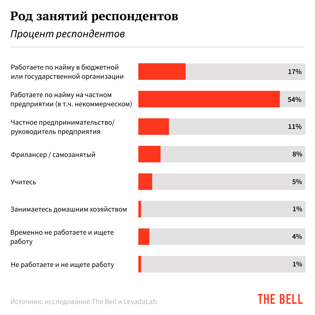 Мы исследуем аудиторию издания The Bell — в нашем Telegram-канале и в рассылке The Bell. Первая часть ответов респондентов, которую мы проанализировали для этого материала, была получена со 2 по 6 апреля 2020 года. Всего в исследовании принял участие 371 человек. Половина опрошенных работает по найму на частном/некоммерческом предприятии, каждый пятый работает в бюджетной организации, на третьем месте — предприниматели и фрилансеры.