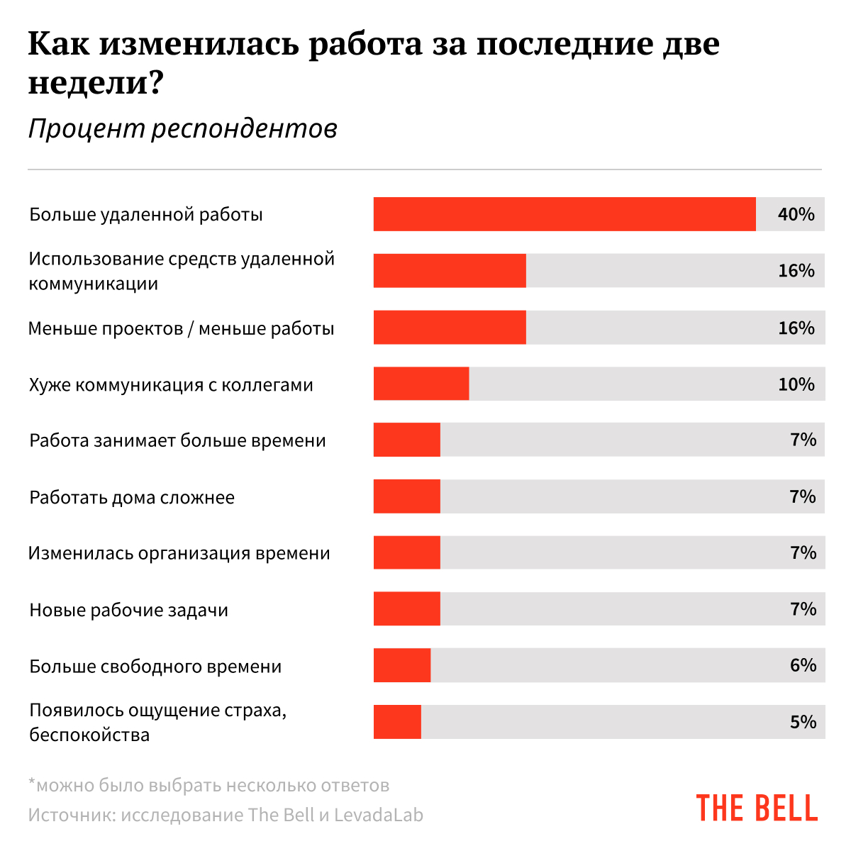 Компании предпочитают сохранять ресурсы, сокращая свои расходы, клиенты не спешат оплачивать работу, просят об отсрочке, что снижает финансовые возможности. - Работать становится тяжелее: респонденты отмечали, что работа занимает больше времени, стало труднее работать из дома, по ощущениям, количество работы выросло, хотя продуктивность могла снизиться или остаться на том же уровне. К рабочим делам добавляются домашние, отсутствие налаженной коммуникации с коллегами растягивает рабочий процесс. Рабочее время перераспределяется: многие отметили, что график стал ненормированным, возникли трудности с самодисциплиной, коллеги не чувствуют границ рабочего времени. Возможность выспаться оборачивается тем, что иногда приходится заканчивать работу «и в 20:00, и в 12 часов ночи». Однако есть и те, кто выиграл от перехода на удаленку, — продуктивность выросла.
