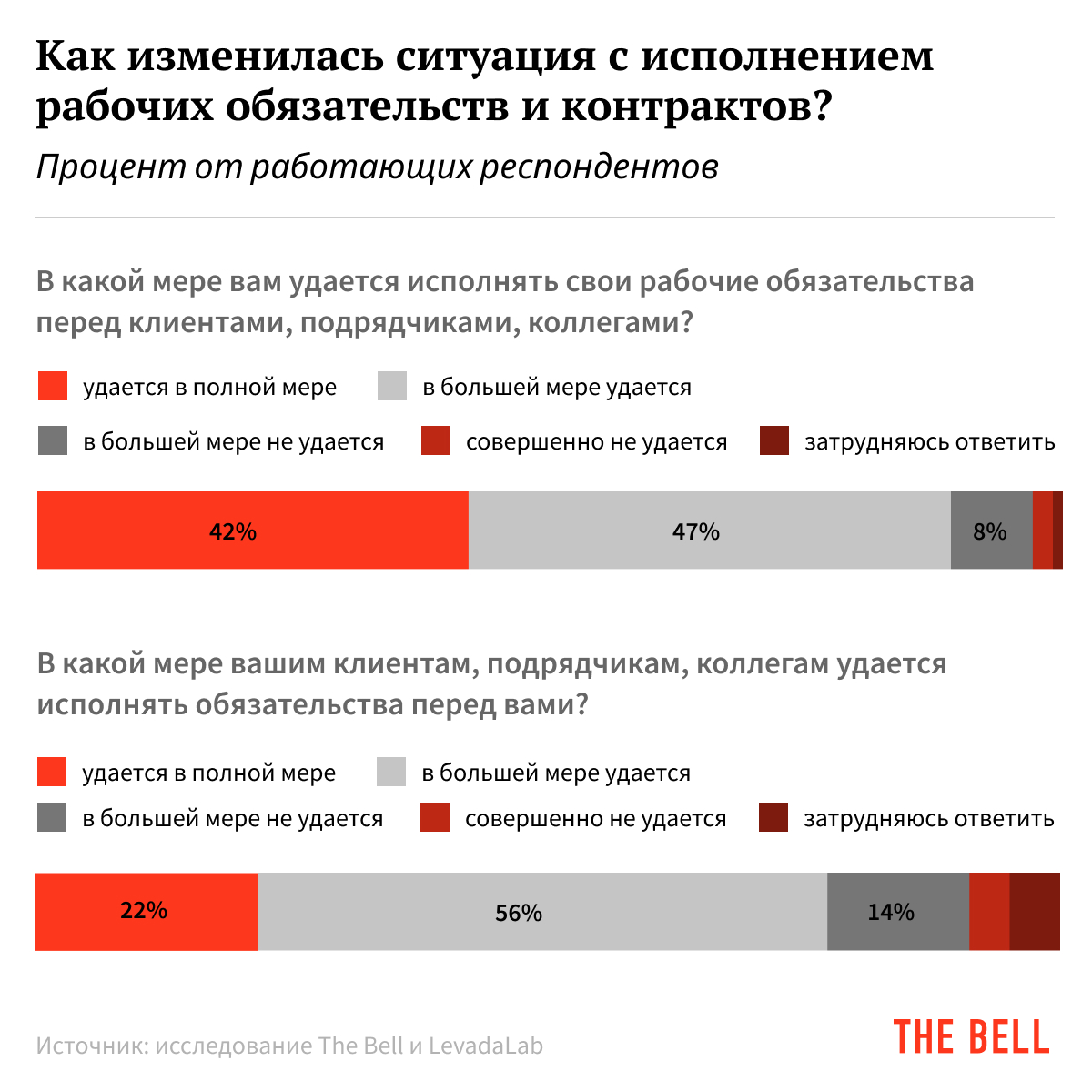 42% считают, что им удается выполнять обязательства в полной мере. Вместе с тем только 22% считают, что коллеги выполняют перед ними обязательства на том же уровне. Меньшинство опрошенных сказали, что им не удается исполнять обязательства (10%). 18% заявили, что это не удается их партнерам.