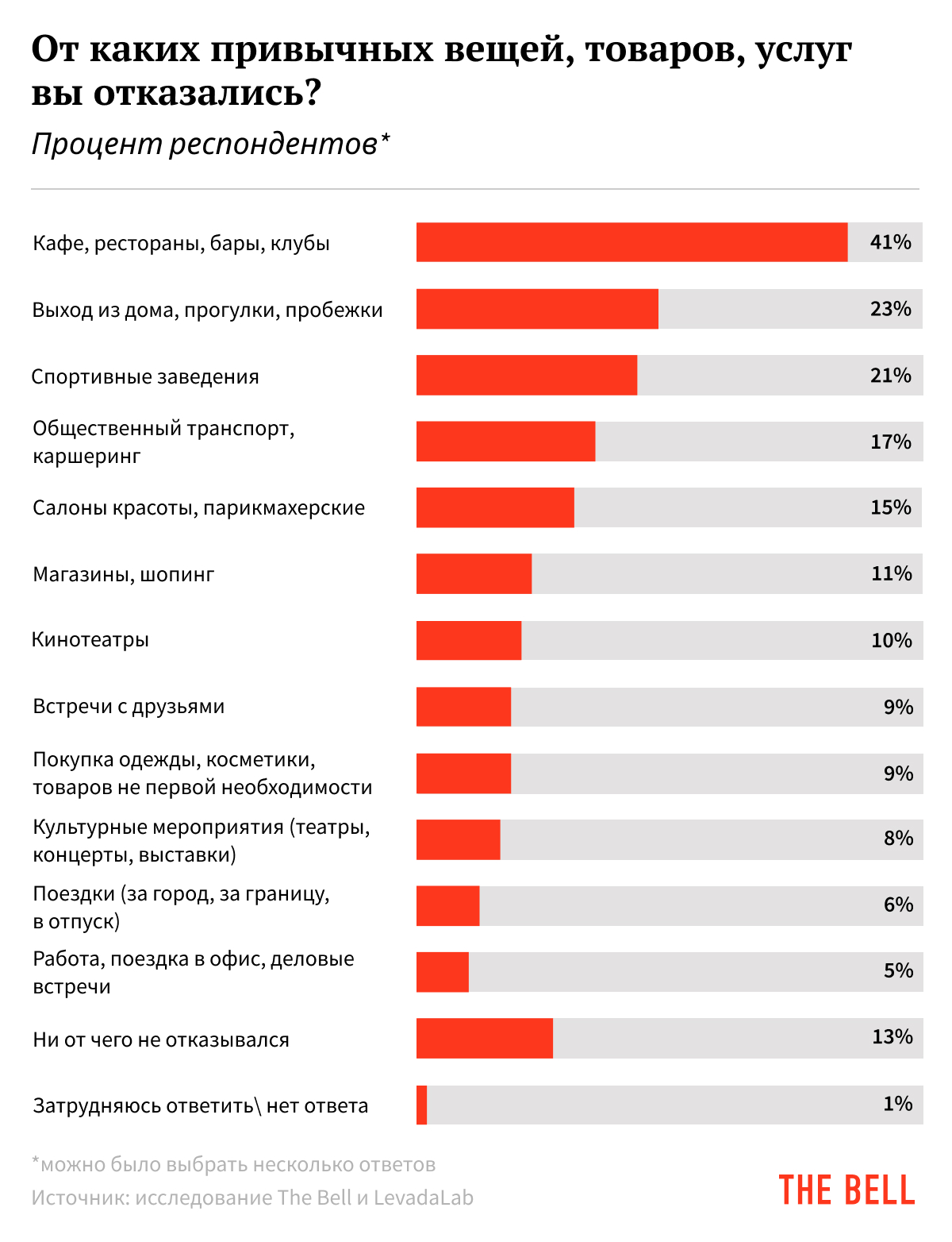 Чаще всего респонденты отмечали, что им пришлось отказаться от внедомашнего досуга (кафе и ресторанов, прогулок и пробежек, походов в спортзал и кинотеатры, встреч с друзьями). Многие отказались от услуг (парикмахерских, бытовых, в меньшей степени образовательных и медицинских). Магазины и шопинг тоже попали в список вещей, от которых пришлось отказаться 11% опрошенным, несмотря на использование доставки. Никак не повлияла изоляция на жизнь 13% опрошенных.