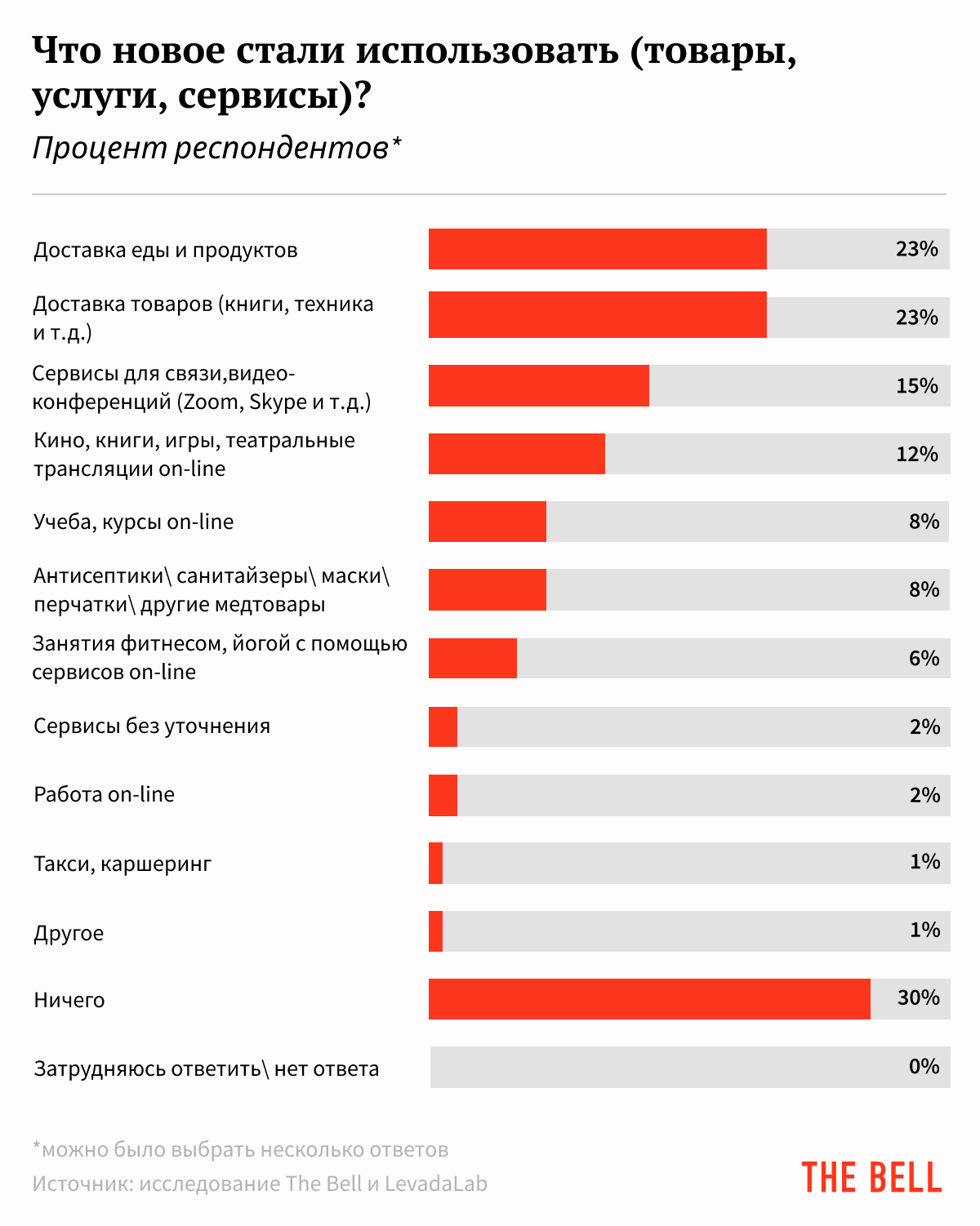 Среди новых сервисов и услуг, которые стали использовать респонденты, чаще всего отмечали сервисы по доставке еды и продуктов, непродовольственных товаров. Несмотря на то что респондентам чаще всего приходилось отказываться от досуга, перевести свои развлечения в онлайн, заняться самообразованием и спортом смогла лишь небольшая часть опрошенных — они на досуге смотрели фильмы и театральные трансляции, читали книги, играли в игры. На втором месте по популярности — самообразование, на третьем — спорт. Ничего нового за время изоляции для себя не открыла треть опрошенных (30%).