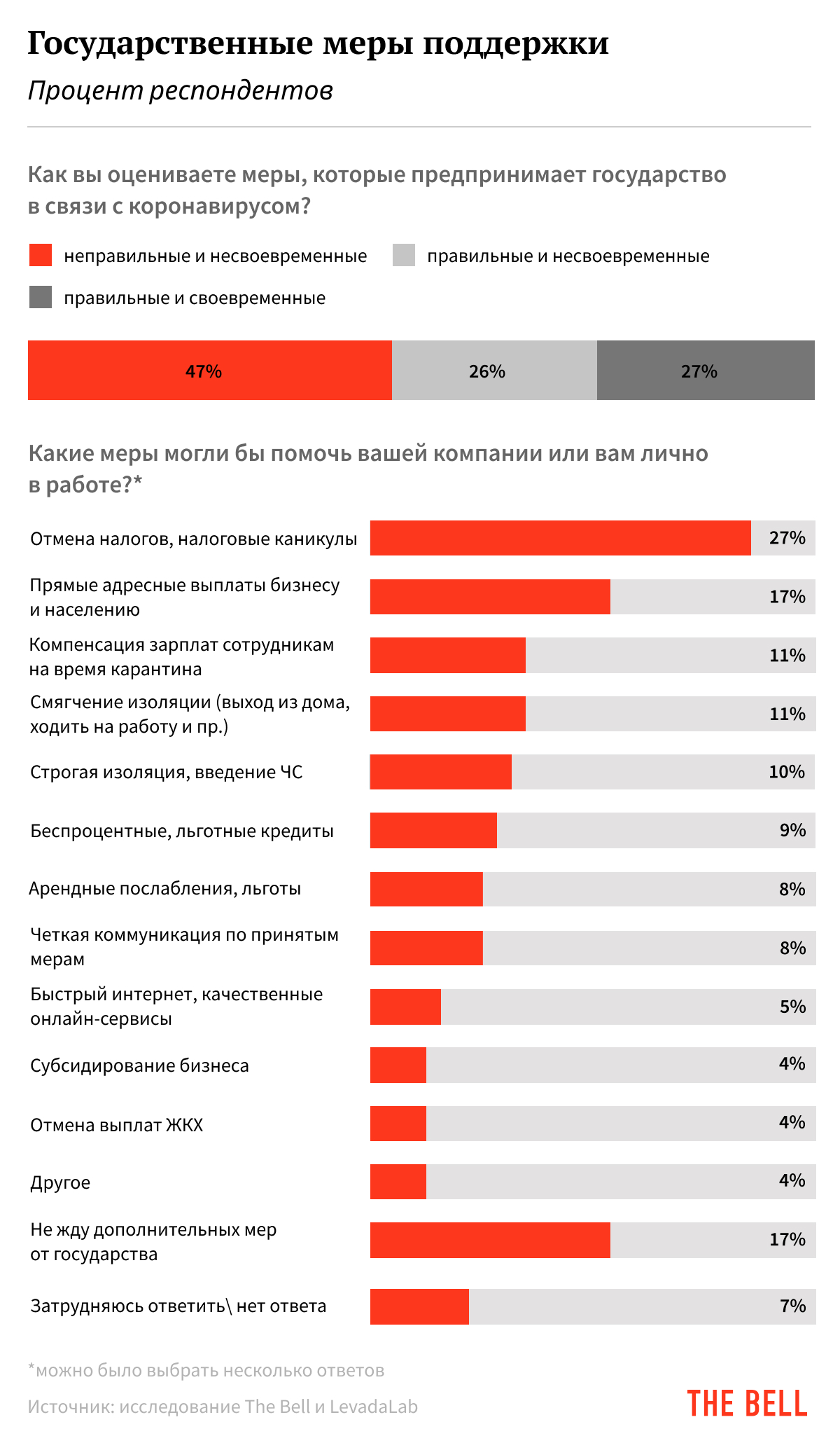 The Bell и Levada Lab (исследовательская лаборатория «Левада-центра») исследуют, как эпидемия коронавируса меняет рабочие процессы и стиль жизни. Вот итоги первой коронавирусной недели на карантине: 47% считают меры, принятые государством, несвоевременными и неправильными, 28% потеряли в деньгах, 27% надеются на отмену налогов.