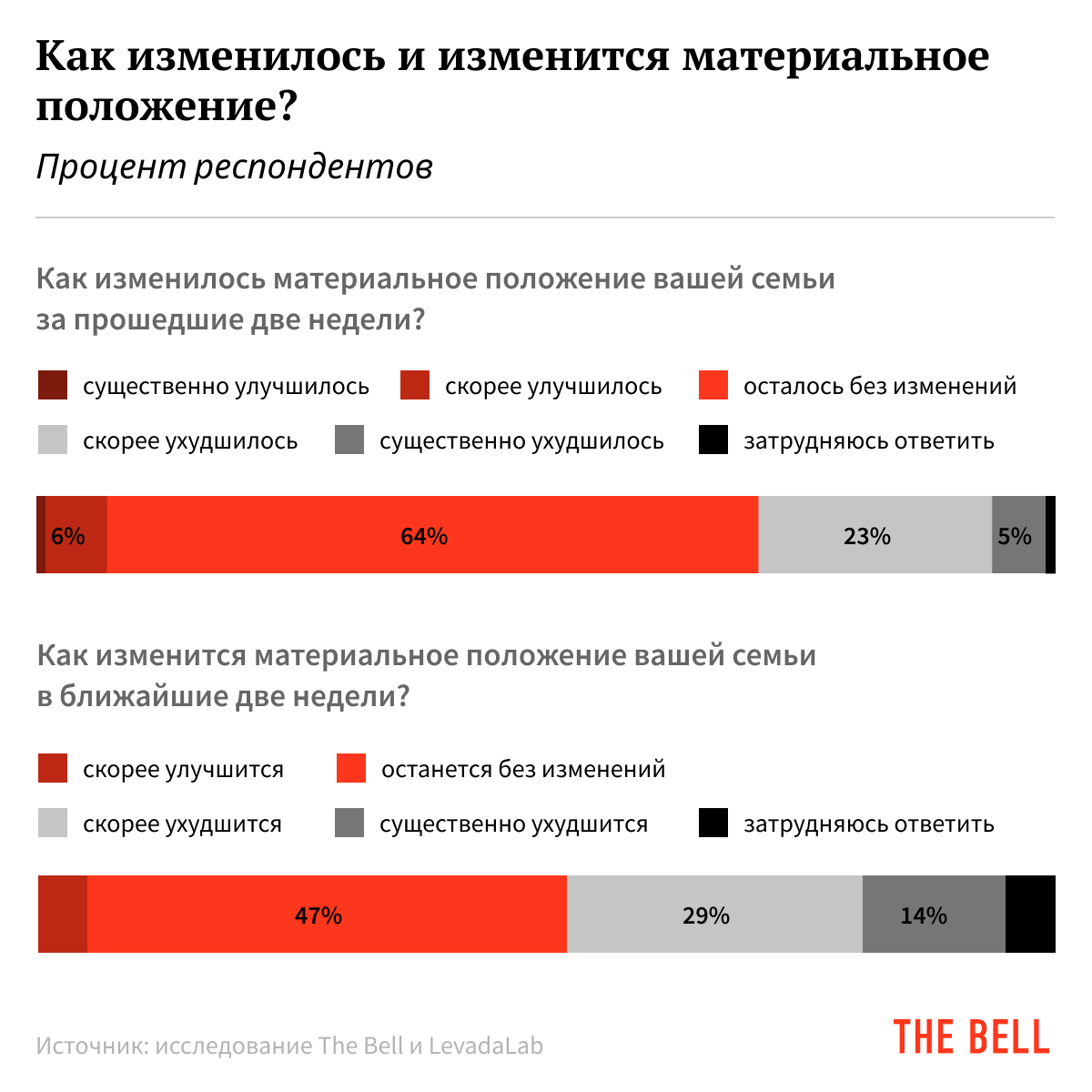 Две трети респондентов не заметили изменений в своем материальном положении на момент опроса (64%), 28% отметили ухудшение, 7% — улучшение. Ожидания респондентов более пессимистические, чем оценка текущего положения. Половина респондентов считают, что ситуация не изменится. Ухудшения ожидают 43% опрошенных, улучшения — около 5%.