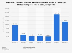 • До 160 тысяч доходит количество упоминаний «Игры престолов» и его персонажей в социальных сетях после выхода одной серии сезона, а за полгода сериал так или иначе упомянули в соцсетях больше 20 млн раз.